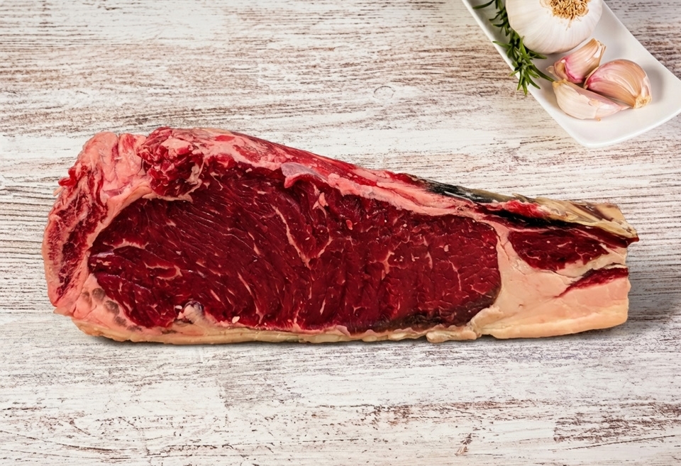 Entrecot de 400 g cortado de lomos seleccionados de vaca Portuguesa, con un alto nivel de infiltración natural que garantiza una textura melosa y un sabor largo en boca.
